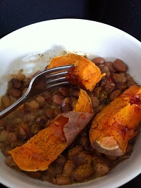 Sweet potatoes are an item that I have started to keep extra of in the pantry as I love to make them quickly for lunches. I have been "anti-microwave" for a number of years and other than to reheat my coffee have stayed away from using it. After watching a few commentaries by a number of respected health professionals I have started to use it, on occasion, I just 'stand back' while it is on. Sweet potatoes are one of those exceptions, at lunch time only. Working from home means more flexibility however it is not interesting to spend a lot of time making lunch. I cut the sweet potato into smaller pieces and put them in a microwave safe (not plastic) dish, put a bit of water in the bottom and a moist paper towel over the top and cook them on high for 5 minutes. They come out done perfectly and then I put some antipasto, salsa and/or soy sauce and tahini and sprinkle them with nutritional yeast and then enjoy. Beans are also a perfect compliment on top. Lots of nutrients, filling and tasty.